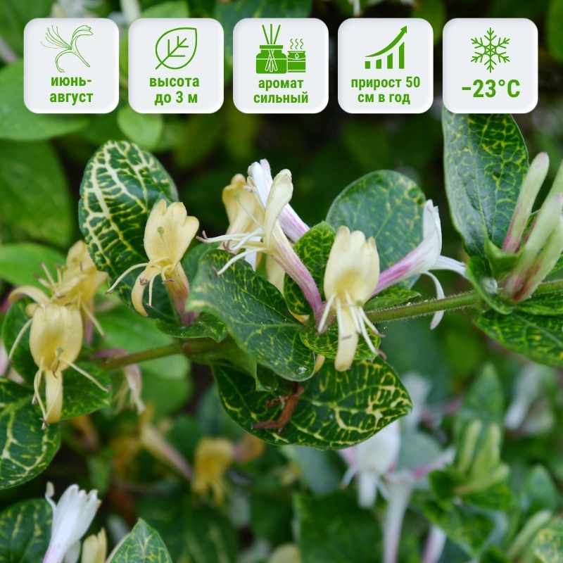 Достаточно не простой сорт жимолости японской Aureoreticulata в плане цветения. Даже при постоянном уходе, лиана может цвести не каждый год. Пусть это Вас не пугает, поскольку данный сорт имеет один козырь- это листва. Чаще всего жимолость имеет обычную, ничем не выделяющуюся зелень, но только не сорт Ауреоретикулата. Её листья имеют постоянную жёлтую окраску в виде сетки на зелёном глянце. Данная лиана вырастает до 3 м и может быть использована в качестве комнатного растения, отличный вариант украшения балкона!