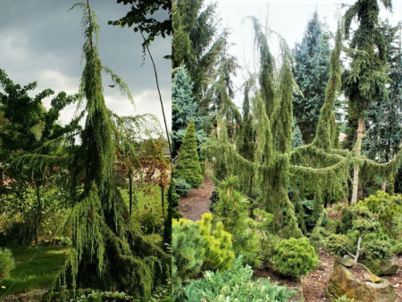 Данный сорт достигает своей максимальной высоты на отметке 3х м. Нарастает он лениво, прибавляя в год всего 15 см, так к 10ти годам он примерно 1.5–2.5 м высотой. Его форма обусловлена длинными, тонкими, изогнутыми ветвями, которые придают кустарнику плакучий, изящный вид. Такая необычная форма делает его настоящим акцентом в саду, создавая интересные вертикальные линии. ВАЖНО: форма растения напрямую зависит от его формирования в первые годы жизни, если его подвязывать, то он будет расти вверх и быть более стройным, если НЕ направлять, то он будет широким и распростертым. Хвоя у этого сорта колючая, зеленого цвета, шишки небольшие серо-голубые, появляются на растении осенью, украшая его дополнительными декоративными элементами. Зимостойкость высокая до −40 °C.Применение в саду: