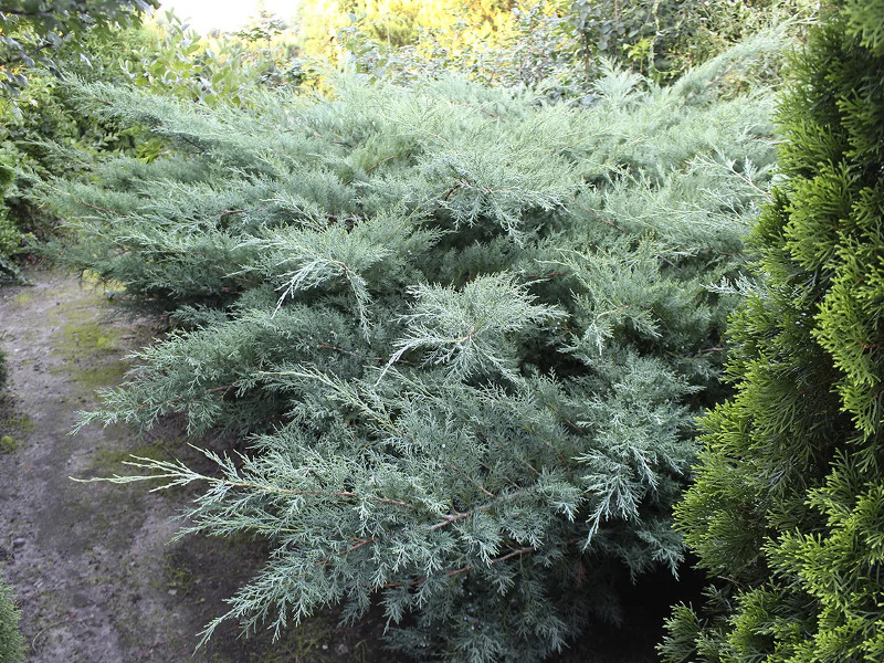 Можжевельник средний Пфитцериана Глаука (juniperus x-media Pfitzeriana Glauca) - это кустарник семейства кипарисовых. Взрослое растение может достигать высоты до 3 метров и ширины до 3-4 метров. Цветность можжевельника среднего Пфитцериана Глаука меняется в зависимости от освещенности. Высадив саженец на солнце, вы получите хвою, схваченную голубым сиянием, если же куст во власти тени, то его поглощают серо-зеленые краски. Осенью хвоя становится бурой, а зимой пурпурной. Хвоя достаточно колюча, ветки покрыты как игольчатой, так и чешуевидной. Ежегодный прирост этого растения составляет всего 5 см в год. Потом сорт идеален для миниатюрных композиций, например альпинариев.