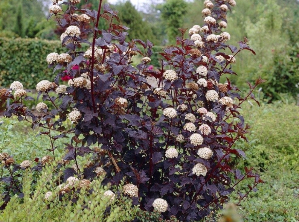 Пузыреплодник калинолистный Диабло - это эффектное растение, с 3х и 5-тилопастными листьями, как у калины (отсюда приставка в названии). Цвет листьев темный пурпурный и проявляет свою красоту лишь на хорошо освещенном участке. С той стороны, где будет падать тень на листья, они останутся темно-зелеными. Кусты имеют внушительный размер - они вырастают до 2-3 метров в высоту и ширину. Ветки под весом поникают, отчего крона приобретает округлое очертание.